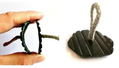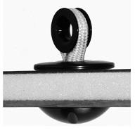 In an effort to simplify and reduce weight, Ropeye (see note below) then appeared on the market with a unique concept called the Loop padeye. The major development was to integrate / bond the Dyneema® loop into a carbon (or glass) base plate. The idea is that the loop is then pushed through a small diameter hole and the carbon base plate is bonded to the underside of the deck, which makes it watertight. The base plate also spreads the load over a wide area of deck, however the safe working load of this system is limited by the bond of the Dyneema® in the carbon plate e.g. a 6mm Loop padeye has a maximum safe working load of approx. 2000kg