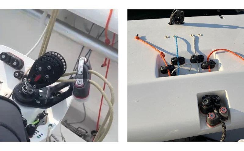 The Barney post and side deck control lines, Max refers to as the "mission control for the helmsman". It's here that the numerous key control systems of deck hardware converge, offering precise control over various aspects of the boat. Max explains, "On the side deck we have the 2:1 course runner that has a snatch/ratchet block under the deck, which acts as a 90 degree deflector into two sets of cam cleats on the side deck. We use two inline cam cleats for security but also because it is very highly loaded due to the runners being very far forward in the boat.”