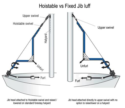 Bei den Harken Furlers Unterdeck geht es darum, die Vorliekslänge der Fock zu maximieren und das Schothorn/Unterliek der Fock bündig mit dem Vordeck zu halten. Der Kompromiss ist eine Gewichtszunahme (Faktor 2,8 bzw. 1,9 für 3mm- und 5mm-Drahtdurchmesser). Als dauerhaftigere strukturelle Installation konzipiert, enthalten alle Unterdeck-Kits (in der Tabelle oben als „UD“ gekennzeichnet) hochziehbare Wirbel.